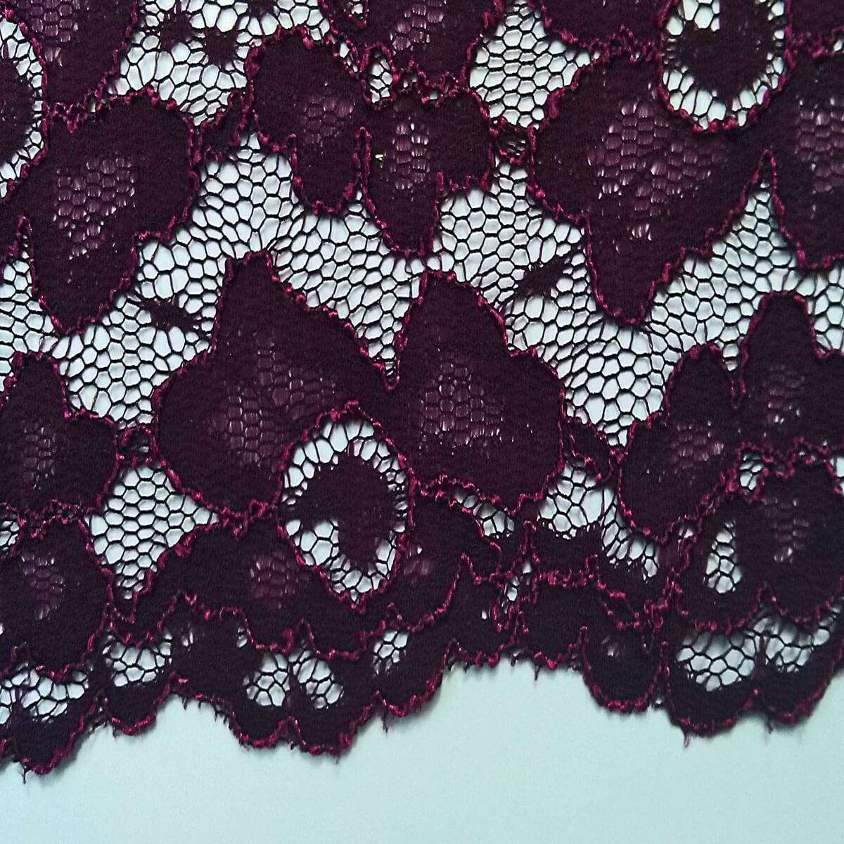Eggplant Re-embroidered Stretch Lace has a 2 way stretch. 52/54″ wide and has a double scallop. 100% Nylon.